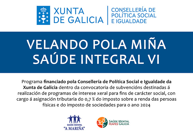A Asociación Saúde Mental A Mariña continua a desenvolver o Programa “VELANDO POLA MIÑA SAÚDE INTEGRAL” que, no ano 2025, chega a súa sexta edición. Este programa, que este ano presentamos conxuntamente a Saúde Mental FEAFES Galicia, a nosa federación, está a ser cofinanciado pola CONSELLERÍA DE POLÍTICA SOCIAL E IGUALDADE, a través da subvención destinada á realización de programas de interese xeral para fins de carácter social, con cargo á asignación tributaria do 0,7% do imposto sobre a renda das persoas físicas e do imposto sobre sociedades.