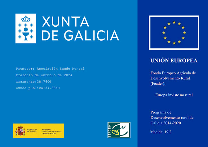 A Asociación Saúde Mental A Mariña conta con unha subvención para execución de un proxecto ao abeiro da submedida 19.2 (apoio para a realización de operación conforme á extratexia de desenvolvemento local participativo), da medida Leader do Programa de desenvolvemento rural de Galicia 2014-2020 para as anualiades 2014-2020, para as anualidades 2023 e 2024, cofinanciadas co Fondo Europeo Agrícola de Desenvolvemento Rural.