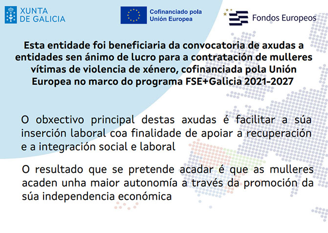 Esta axuda responde ao obxectivo político 4: “Unha Europa máis social e inclusiva, por medio da aplicación do piar europeo de dereitos sociais”; prioridade 2: “Inclusión social e loita contra a pobreza”; obxectivo específico ESO4.8: “Fomentar a inclusión activa co obxecto de promover a igualdade de oportunidades, a non discriminación e a participación activa, e mellorar a empregabilidade, en particular para os colectivos desfavorecidos”, e medida 2.H.01: “Apoio á inserción laboral de mulleres vítimas de violencia de xénero”.